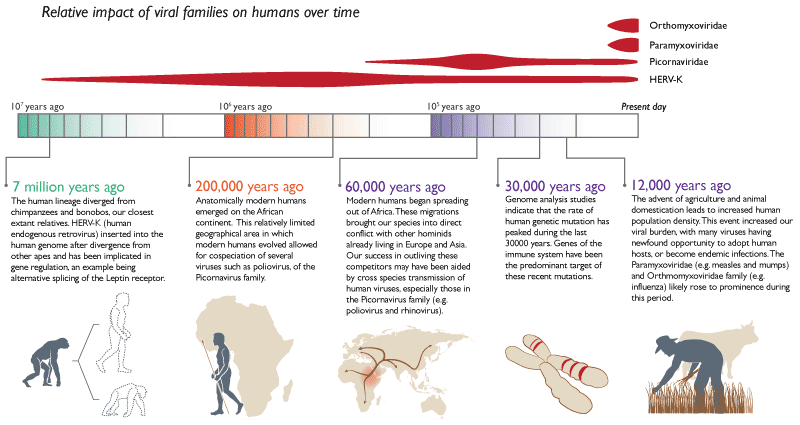 Virulence, and link with evolutionary history: Tracing the history of viruses, tracking their virulence and mutations also gives insight into human evolution, primate evolution, vertebrate evolution and ultimately the evolution of surface life. This becomes evident when studying some viruses like HPV, Herpes, and Hepatitis.