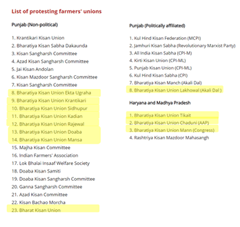 Just look at who is driving the protests in the enclosed list. We see the following – a bunch of purely political parties and the Bharatiya Kisan Union (highlighted in yellow). The President of the Bharatiya Kisan Union is Mahendra Tikait, the son of the same leader Mahendra Tikait who brought the Rajiv Gandhi government to its heels in 1988. Mahendra Tikait belongs to the Rashtriya Lok Dal, a Jat and farmer party, which has an alliance with the Samajwadi party in Uttar Pradesh and fought against the BJP. In the 2014 Lok Sabha elections, it was galling for him to lose his election deposits by getting just 9539 votes against the more than 5.2 lakh votes for the BJP. A person who got 9539 votes claims to represent all farmers in India and the media too gives him a free pass. It is fine for protests to be political as it is the job of the opposition to oppose, but protestors to claim no political bias is blatant hypocrisy.